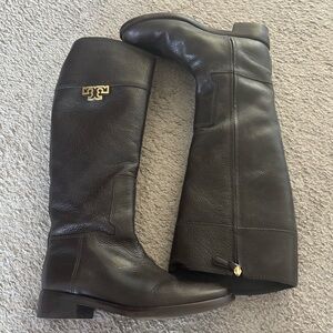Tory Burch riding style boots in brown with gold detailing. Knee height and full length zip inside the calf for ease of putting on and taking off. Please see photo of bottoms for wear, no signs on rest of boots