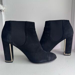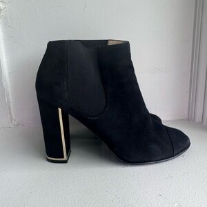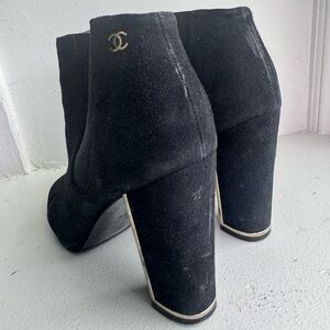 CHANEL Black Suede Gold Logo Chelsea Heel Ankle Boots IT 38.5