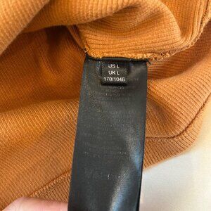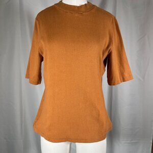 • MAEVE Anthropologie ribbed blouse short sleeves, mock neck, and pullover style, in an orange-ish brown camel color.