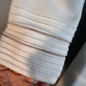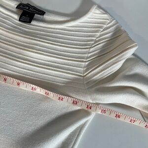 Comforable and soft stretchy sweater dress. Knee length, fit and flare. Sheer mesh details at cuff, neck, and hemline. Like new worn one time at Christmas. Ready for its new home!