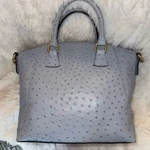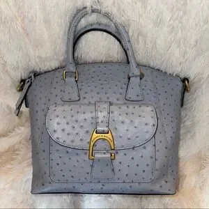 Dooney & Bourke Naomi Emerson Ostrich Satchel in Glacier Blue. Front pocket with Italian custom hook and closure. Top zip closure. Dual rolled handle drop of 3.5”. Interior zip pocket, three slip pockets and key hook. Feet. Removable 18-21” adjustable strap. There are some imperfections but overall in excellent condition. Please review pics for overall condition. Really pretty.