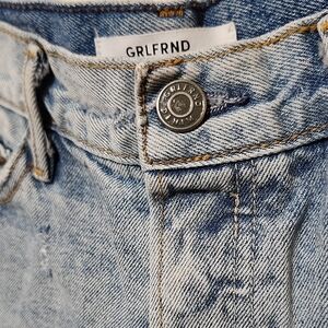 These GRLFRND jean shorts feature a stylish cut-off design with frayed hems, perfect for a casual summer look. The blue and white color scheme adds a fresh twist to the classic denim style, making them a versatile addition to your wardrobe. Enjoy the comfort and trendiness of these must-have shorts for any laid-back occasion.