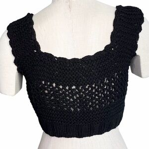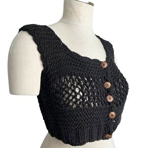 Womens Crochet Tank Top Size Medium Cropped Button Up Chunky Open Knit Black Scoop Neck Wood Buttons Boho Hippie Beach Cottagecore Festival Casual
