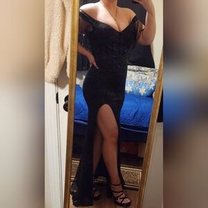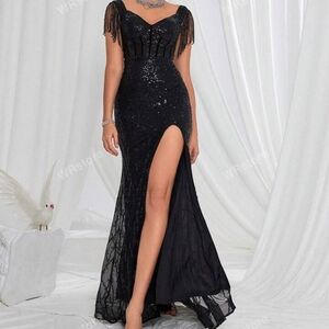 This stunning black evening gown features exquisite detailing and a sophisticated design. Perfect for formal occasions, it offers a timeless elegance that will make you stand out. Beautiful detail, high slit, and sleeve tassels w a zipper in the back. Size XL fits a 12.