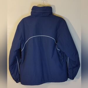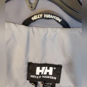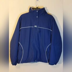 Stylish blue jacket with white accents by Helly Hansen. Many Neat features including a hood,pull strings ,zip and snap closure;and front pockets. pre-Loved please see attached photos for size style and condition. EUC. P2P 22in., Length 24in., Sleeves 23in