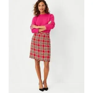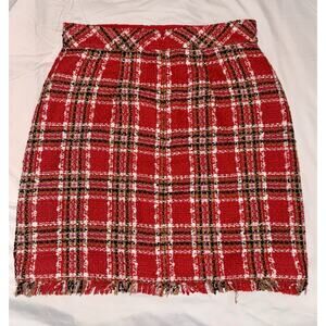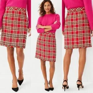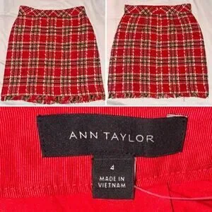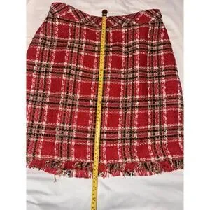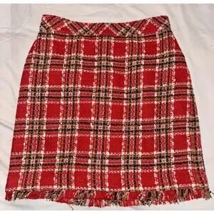 Ann Taylor Plaid Fringe Tweed Skirt Classic Red 578511 Sz 4 Top Of Knee NWOT