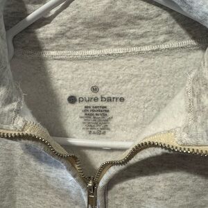 Stay warm and stylish with this Pure Barre Heather Gray quarter zip sweatshirt. Perfect for casual outings or cozy days at home. Pure Barre and words are embroidered.