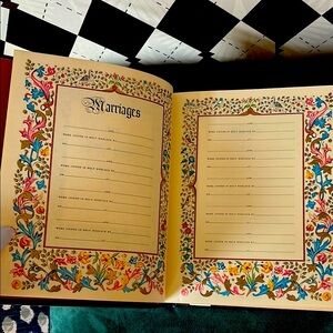 Elevate your home library with this stunning vintage REMBRANDT Edition Family Holy Bible, a true heirloom piece featuring the Authorized King James Version with gold gilded page edges, intricate illustrations, and dedicated family record pages to document marriages, births, and other significant life events. This massive, highly ornate Bible is perfect for collectors, families looking to preserve their history, or those who appreciate antique religious texts.