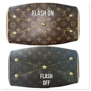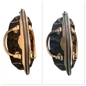This classic features stylish details such as an inverted pleating, leather trim, bottom goldtone feet, & a goldtone zipper LV charm pull