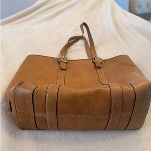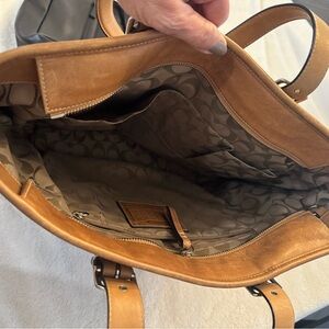 Vintage Coach tan leather tote in good used condition. No tears or damage. The leather has some light scuffs and wear. The inside is clean with no odors. Carry all with an outside pocket and multiple pockets inside.