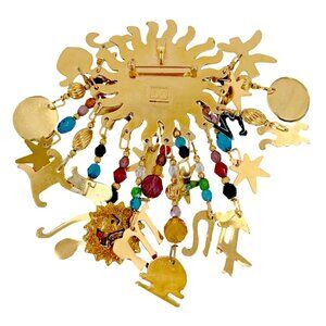 Embrace the cosmic energy of the zodiac with this breathtaking Lunch at The Ritz "Zodiac Sun" Pin. Handmade in the USA and designed by Esme Hecht, this dazzling piece features a radiant sun face surrounded by astrological symbols, Austrian crystals, and Czech glass beads. With its intricate enamel detailing and 22k gold-plated finish, this celestial treasure is a must-have for collectors and astrology lovers alike.