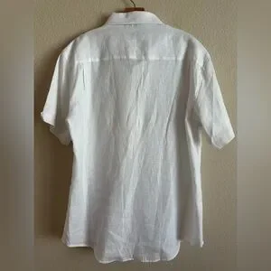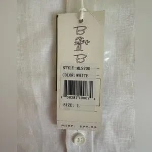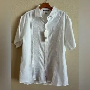 Bohio crisp white linen fancy Guayabera style men’s button up shirt new with tags. Size US Large. Pintuck embroidered front. Button details on sleeves.