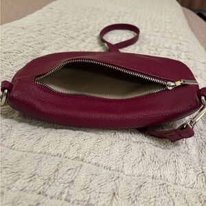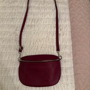 This chic red (Bordeaux color) crossbody bag is crafted from high-quality leather, featuring a sleek design and a secure silver-toned zipper closure. Its medium size and long strap make it perfect for carrying your essentials in style.