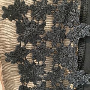 Classy dress with lots of style. From lace to embroidery accents, this dress is a must for every wardrobe. The shell and lining are both made of 100% polyester. The embroidery is stunning. Has loops if you want to accessorize with a belt as well. Mostly black with a tan shell lining. White and black lace highlights front of dress. All buttons attached and hidden under tan flap in front.