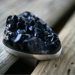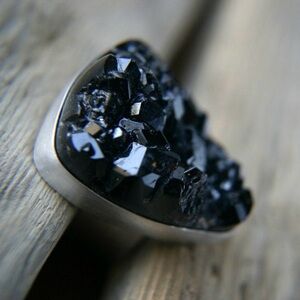 A natural, raw Andradite black garnet stone- it's natural crystals sparkle beautifully- has been set in a silver bezel. The ring dimensions are 34 x 28mm.