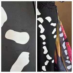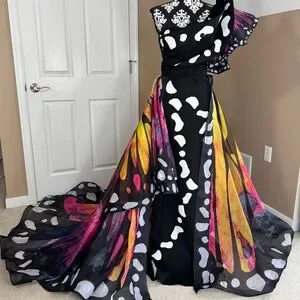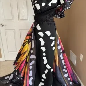 If you want to stand out, this is your gown! I’ve never seen a dress photograph so beautifully. The gown has a single ruffled shoulder with an asymmetric neckline and a designed waist belt with a long sweep train. It also has a couple butterflies attached which adds a special detail. I’ve worked with a lot of dresses and this is the coolest dress I’ve ever seen in person! I would say the dress is true to size, it does appear to have a little bit of a stretch to it. Long enough for someone 5’10. This dress is in nearly perfect condition. There are no holes. There are no tears. Dress has never been altered. It does appear there are two markings on the gown see last photo, I’m pretty sure it’s just from being in the box though, and they may come out. I’ve also added an additional photo from a distance because you cannot see these marks on the dress once you step back.
