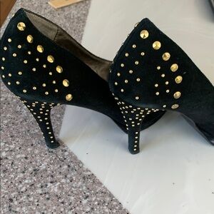 Elevate your style with Moda's stunning black and gold heels, featuring a sophisticated peep-toe design and dazzling gold stud accents. The high, slender heel adds a touch of elegance, making these shoes a perfect choice for any glamorous event. Some wear on stiletto bottom. 4 inch heels. Size 9.5M