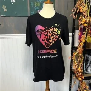 Black t-shirt featuring a colorful heart graphic with butterfly details. Perfect for the hospice nurse. This top is super soft and one of my favorites when I worked hospice.