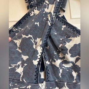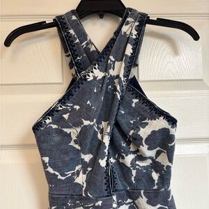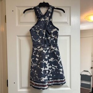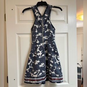 Super cute halter neck dress. Embroidery on the trim and bottom. Fully lined. Has zipper in the back. Cut out piece in the front. Fits true to size.
