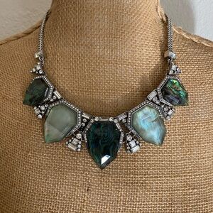 This stunning Chloe + Isabel necklace features a bold design with large, irregularly shaped green gemstones set on a substantial silver-toned chain. The polished cabochon stones are complemented by smaller clear crystals, adding a touch of sparkle to its organic and elegant aesthetic.NWOT