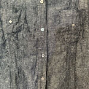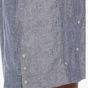 Breathable and lightweight this dress is perfect for travel and any summer activities. 100% linen with button and pintuck detailing. Classic fit with short cuffed sleeves, two chest pockets, a point collar, and an internal white slip. Machine washable and in great condition.