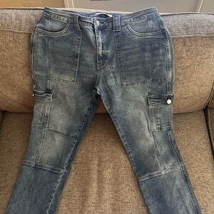 Trendy blue denim cargo jeans with multiple pockets. Perfect for casual wear.