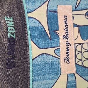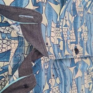 excellent used condition. 2X. Tommy Bahama 70% Silk. 30% Polyester. Blue and white with fish print. Short sleeve. chest 28 inches. length 33 inches. B 9