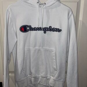 White Champion hoodie with logo embroidery. Comfortable and stylish.