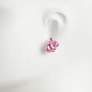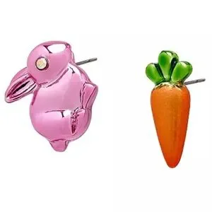 Whimsical spring inspired coordinating mismatched stud earrings featuring playful pink bunny and carrot:Set in polished multi-colored coating over metal