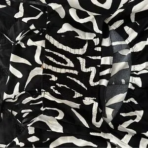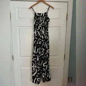 Stylish black and white patterned jumpsuit perfect for any occasion. Enjoy a comfortable fit with a chic design. Open back with elastic and adjustable straps. 28” inseam.