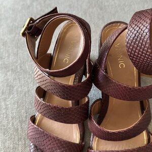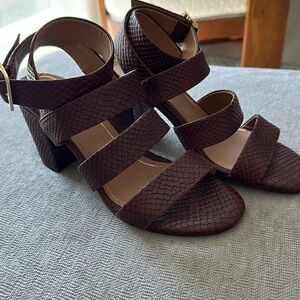 Great condition 8.5 - bought them but could not wear due to knee issues. Vionic open toed buckles around the ankle heel in a beautiful deep burgundy color. Would go with so many things