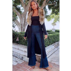 An absolutely beautiful boho-chic long cardigan from Show Me Your Mumu! It's one of those timelessly trendy pieces that take any outfit to the next level! It is made from great-quality soft stretchy knit material (50% viscose, 30% polyester, 20% nylon). Desinged with a comfy, relaxed silhouette, an open front, side patch pockets, high-quality velvety-soft stretchy vegan suede, a gorgeous faux red fox fur collar (70% acrylic, 30% polyester), ribbed cuffs and hem, and rich long length. It is a very versatile piece that will look equally fabulous with leather pants/distressed denim skinnies as it is with a dressy outfit. Revolve Style No. SHOW-WK59. Manufacturer Style No. MR9-3011. Approximate measurements unstretched flat: Pit to pit 20.5", Sleeve 24.5", length 48". Excellent condition from a clean, smoke-free home.
