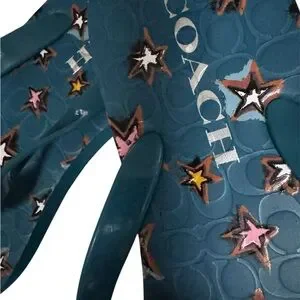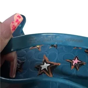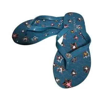 Stylish blue flip flops with a colorful star pattern. Features a Coach logo.