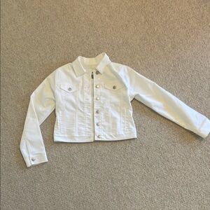 Stylish and versatile white denim jacket for kids. Perfect for layering and adding a touch of style to any outfit.