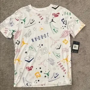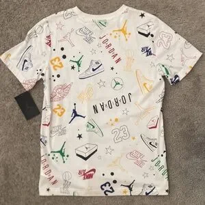Vibrant graphic t-shirt featuring iconic Nike Air Jordan designs. Perfect for casual wear.