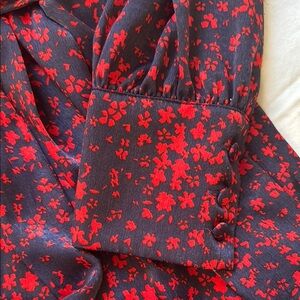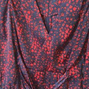 Elegant women's dress featuring a striking red floral pattern on a black background. Perfect for any occasion.