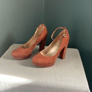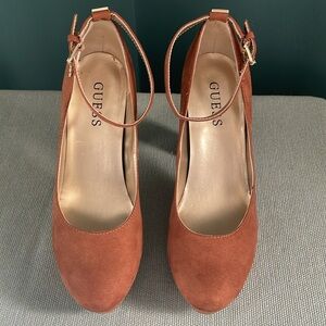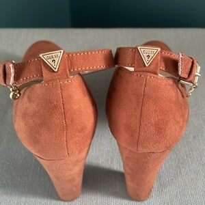 Step out in style with these elegant brown platform heels by guess , Perfect for any occasion, these shoes offer both comfort and sophistication. Beautiful details throughout the design of the shoe. From the added patten leather strip to support the buckle holes , the little charms accenting the ankle strap and the signature metal guess tag at the back of the shoe .