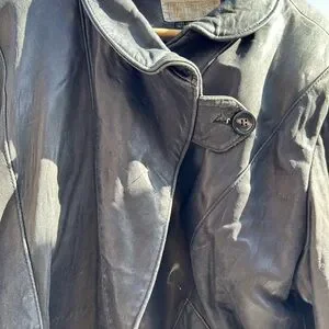 This beautiful black leather coat is naturally distressed (by me😉) over the years. Unique details, two button closure at waist, zipper and button closure at neck.