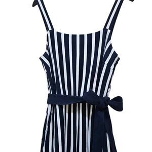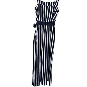 J Crew knit tie waist blue and white striped jumpsuit. 2 front pockets.