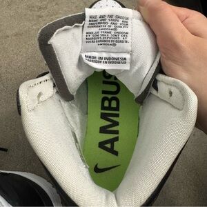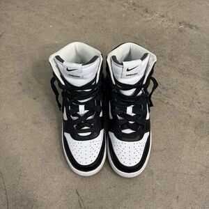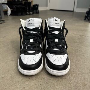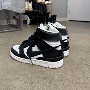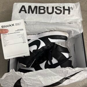 The Nike Dunk High Ambush Black arrives with a white and black leather upper in traditional color blocking (a design format similar to early Nike Dunk releases in 1985), and an exaggerated Swoosh that extends beyond the heel. Outside of the re-imagined Swoosh, other features differentiate this design from traditional Nike Dunks like a raised heel counter with significant separation on the back of the shoe, revealing a larger amount of white leather panelling, and an extended black plastic unit donning Ambush branding encapsulates the heel. An exposed foam tongue, white sole, and co-branded tongue tag complete this design.