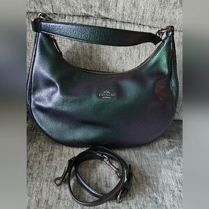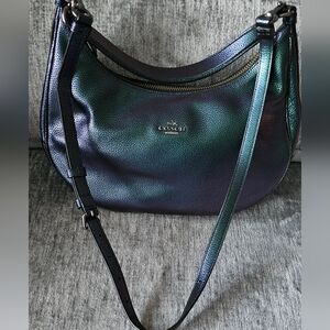 Extremely rare and hard to find! Beautiful eye catching hobo crossbody made by coach. This gorgeous bag displays metallic blue purple and green colors, depending on how the light hits it. this bag is stunning and in excellent like new condition. exterior width is 13.5, Height is 8 inches, it has a inside zip pocket and 2 slit pockets. clean inside no foul smells. holographic pebbled leather. final mark down price firm