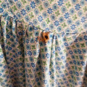 Handmade cotton Prairie/Pioneer dress, It is green & blue flowers with green ruffle at the bottom with matching drawstring purse. There is a 17" zephyr zipper in the back. No size, here are the measurements: from top to waist 14 1/2", from waist to bottom 39", waist is 13 1/2" laying flat, chest is 16" laying flat, shoulders across back is 14 1/2". Condition: There is a repair (tear that has been sewn shut) in the front above the ruffle, also a small discolored hole on the right side at the waistline.