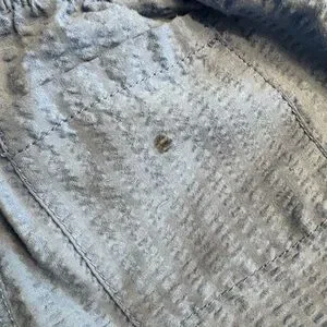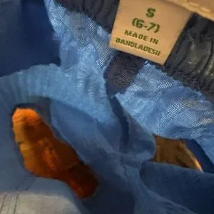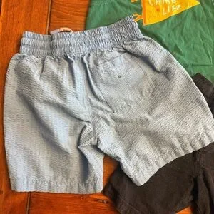 -Light blue shorts have a textured swim trunk feel but they aren't lined. Small black dot on the back pocket.