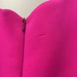 Vibrant hot pink sleeveless dress by Bebe. Features a stylish v low front and back zipper detail.