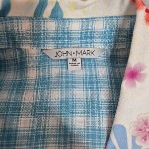 This is a women's shirt top by John Mark, featuring embroidered floral accents, 3/4 sleeves, and a collared neckline with a button closure. The garment is made of a blend of rayon, viscose, and linen in a relaxed fit, perfect for travel or casual wear. The color is blue, and the style is a basic button-up tunic suitable for all seasons.