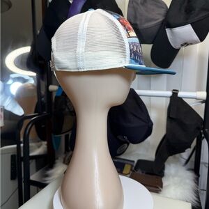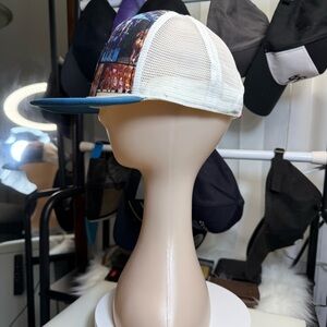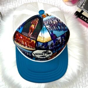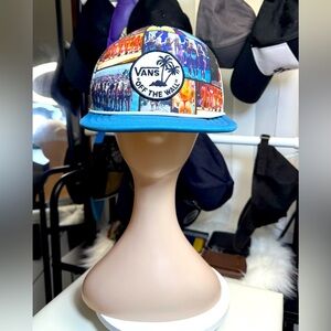 Vans cap with vibrant multicolor graphics. Features a blue brim.
