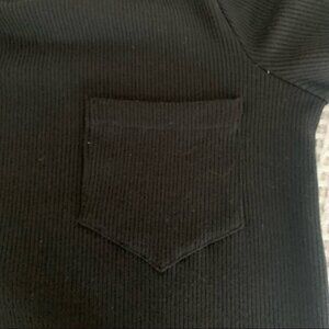 Black, ribbed tee midi dress. One small pocket on the breast. Side slit
