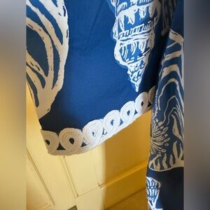 This elegant maxi dress features a stunning blue and white pattern, perfect for any occasion. The intricate design adds a touch of sophistication to your wardrobe. I wore it one time. It is in an excellent condition. No alteration. Smoking free.