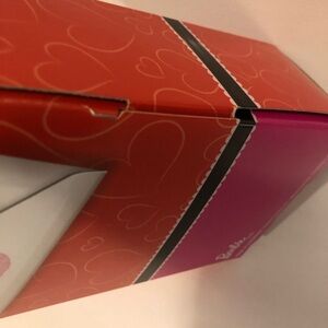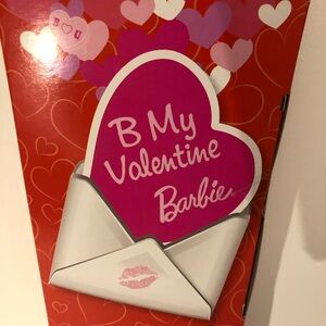 *Valentine special Barbie doll is original owner, new in box and in good condition with some very minor storage wear marks on box (pictured); features the long blonde hair version of Barbie with a dark pink & red heart print dress, red jewelry on doll and a child size plastic heart faux stone barrette