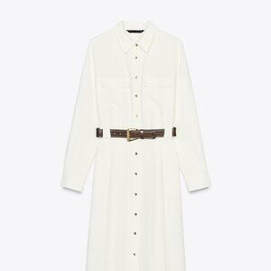Lapel collar dress with long sleeves. Front pockets. Front button closure and belt.